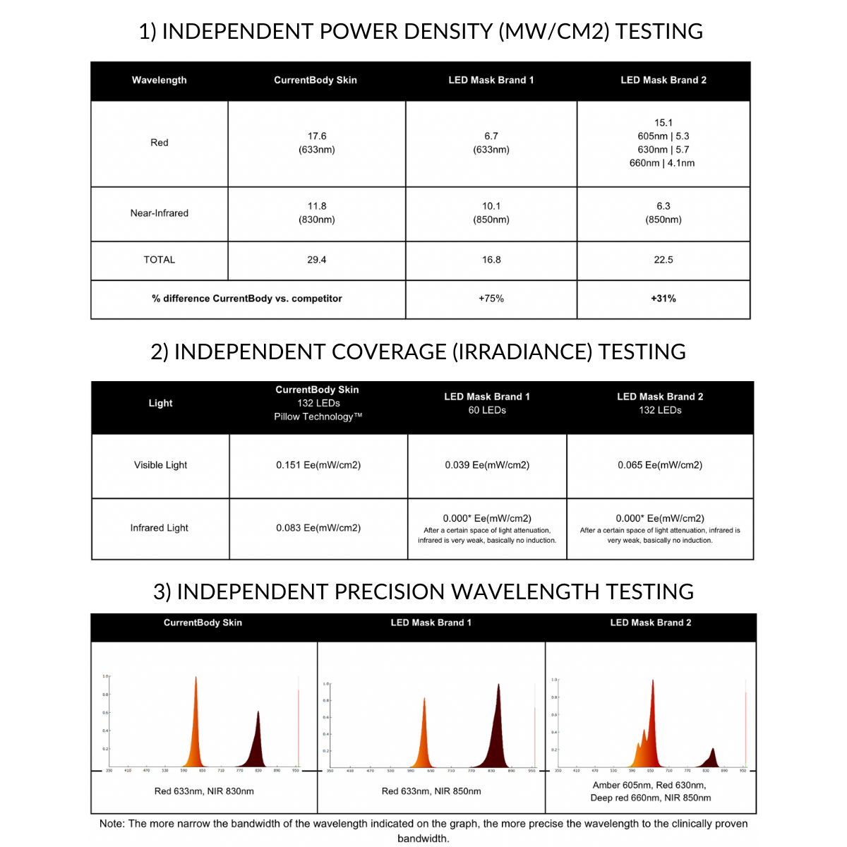 Embedded with 132 LED (light-emitting diode) bulbs, 66 red (633nm) and 66 near-infrared (830nm), the clinically proven wavelengths are diffused with patented pillow technology for complete skin coverage. This innovative technology enhances the efficacy and distribution of high quality LED wavelengths.